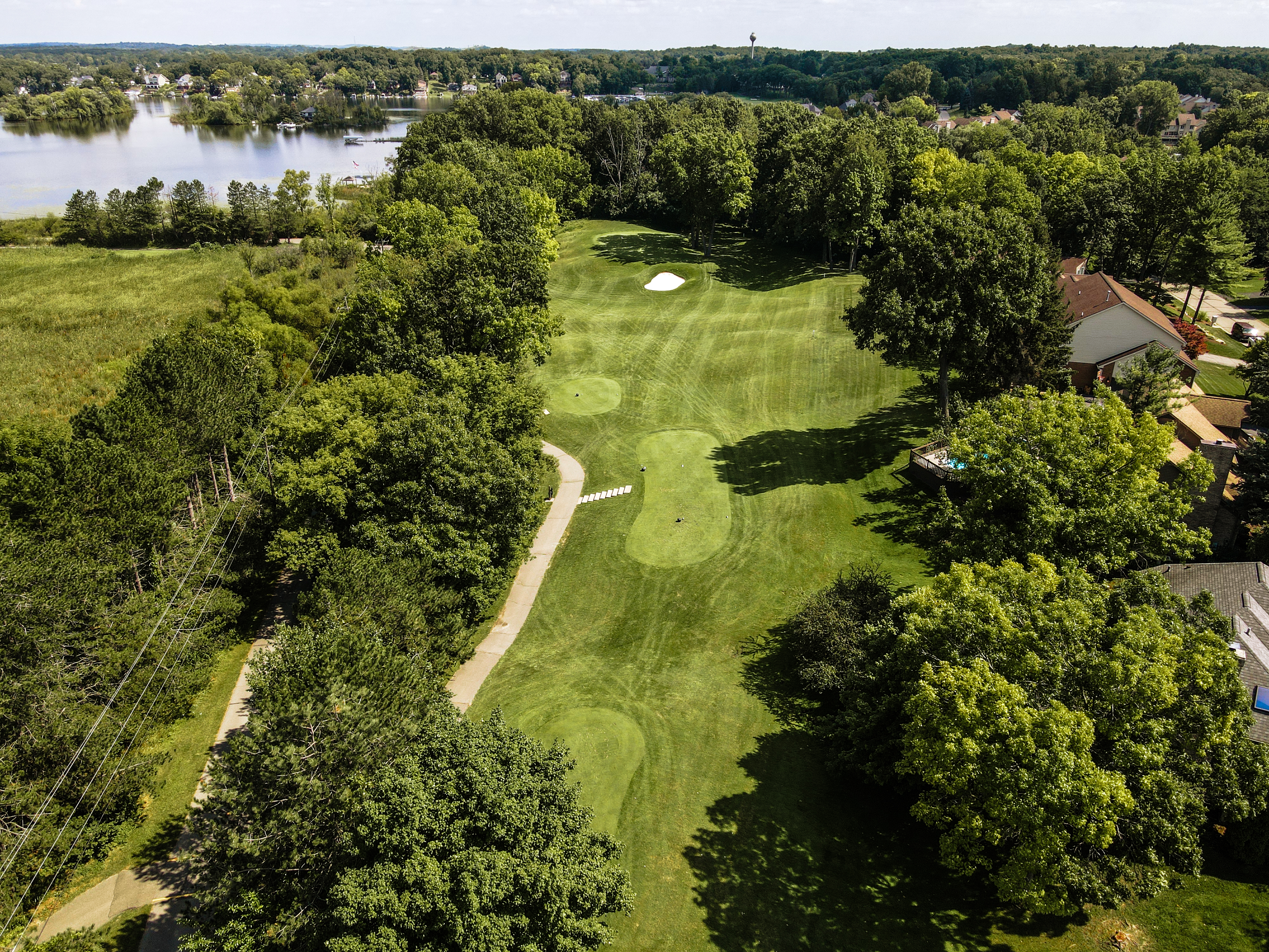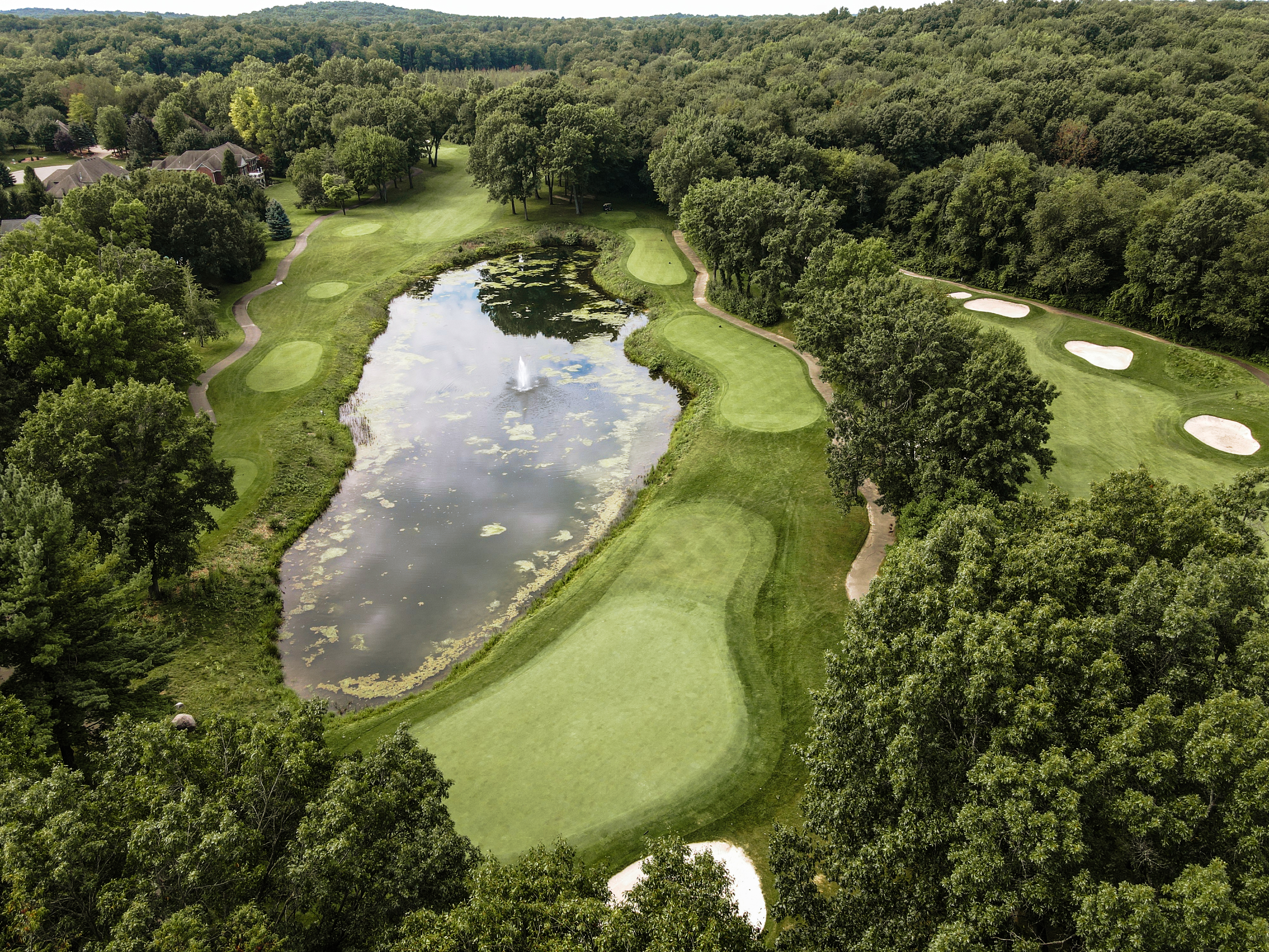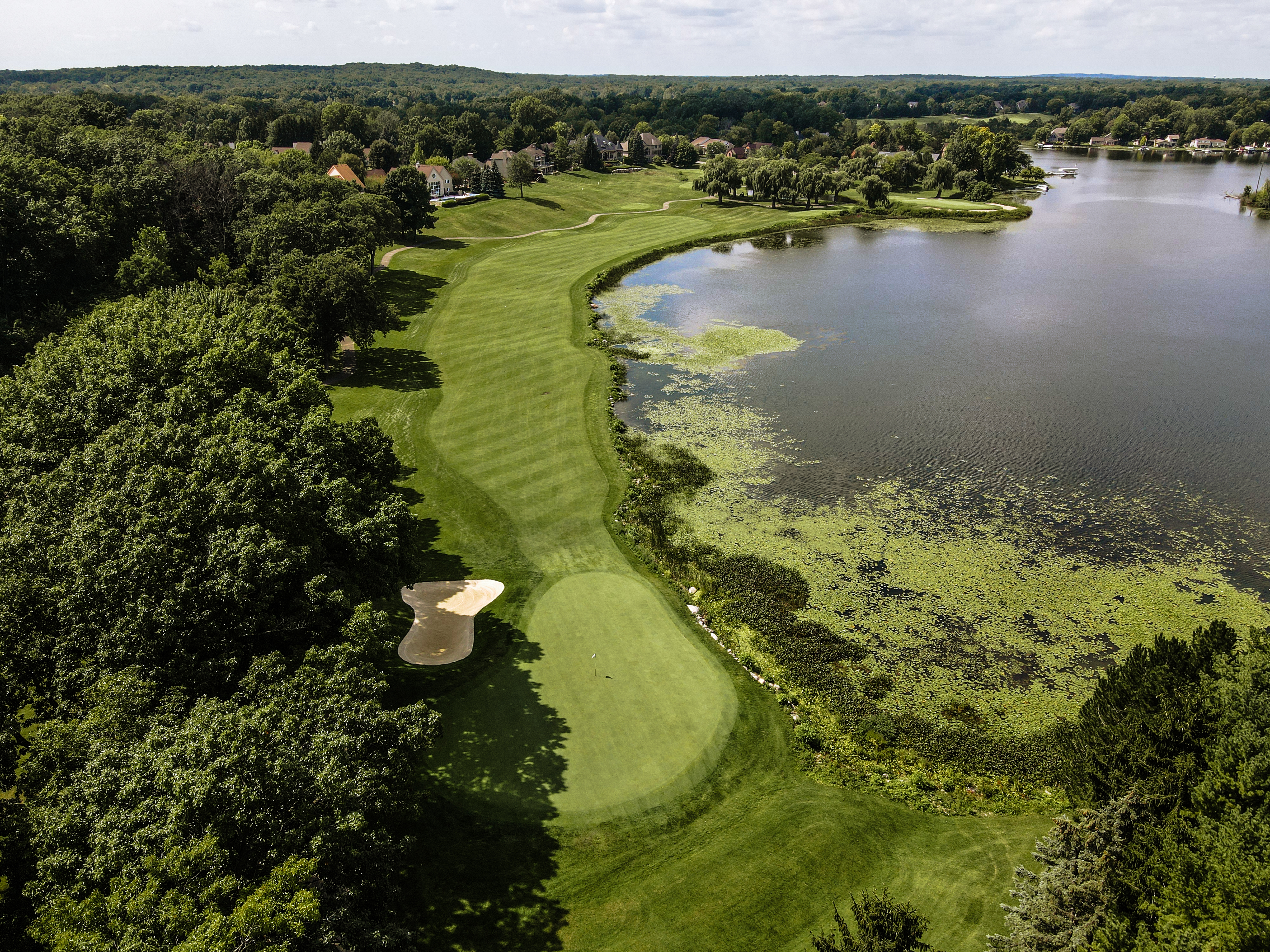 Walking up to the tee of this beautiful hole, Crooked Lake just beyond the flag stick creates a Scenic back drop. This green is protected by a front left bunker and another wrapping the backside of the green