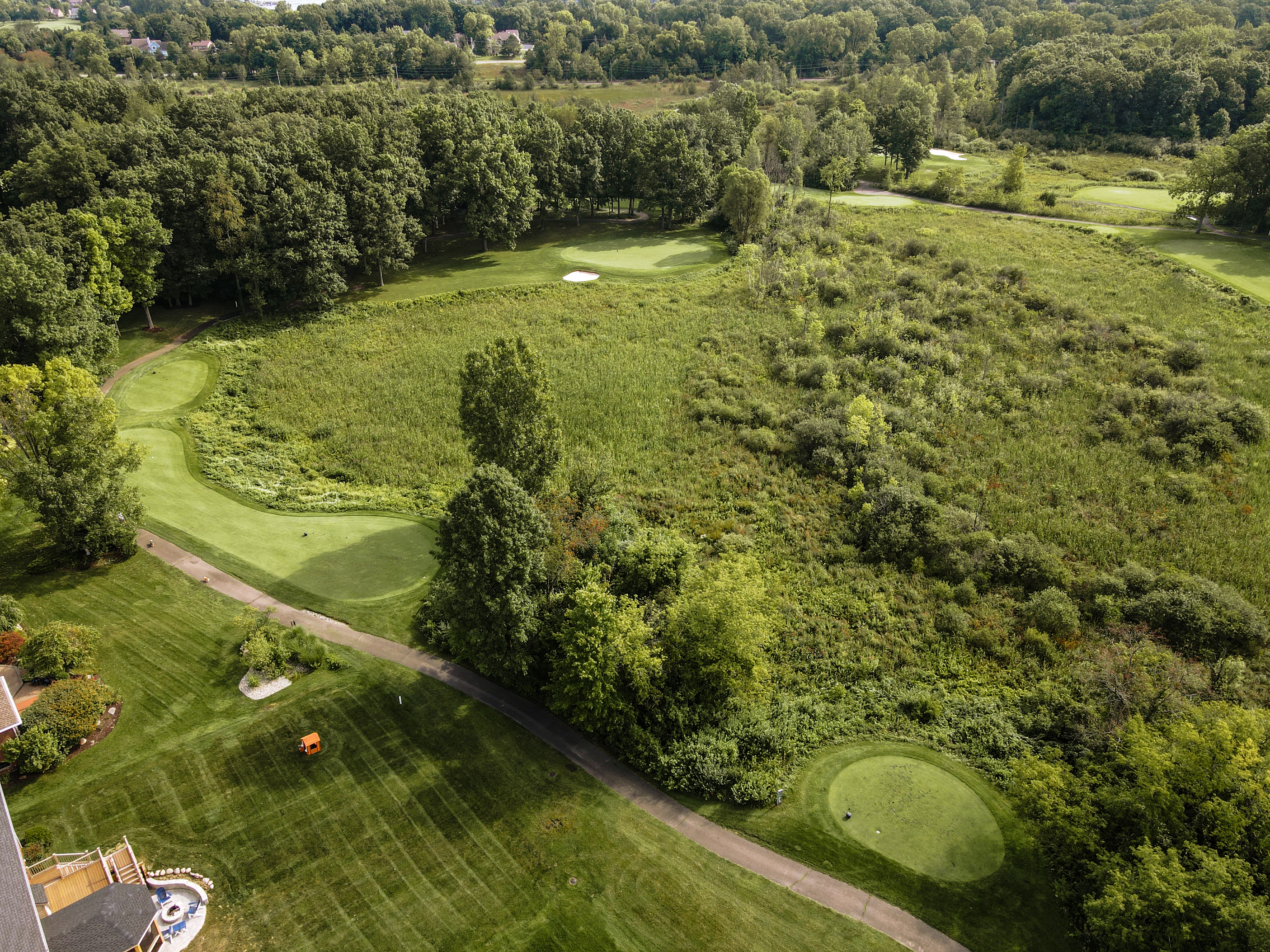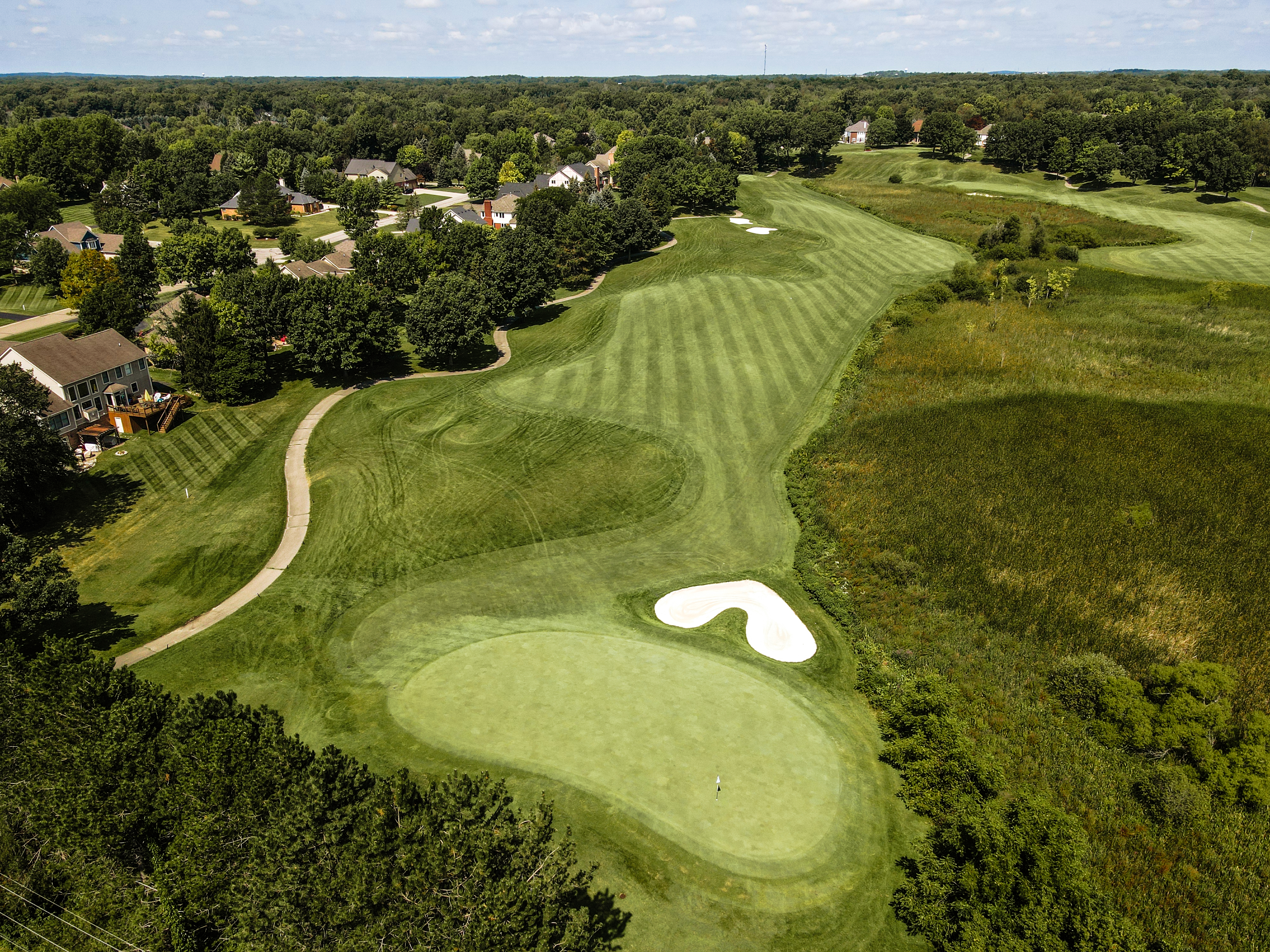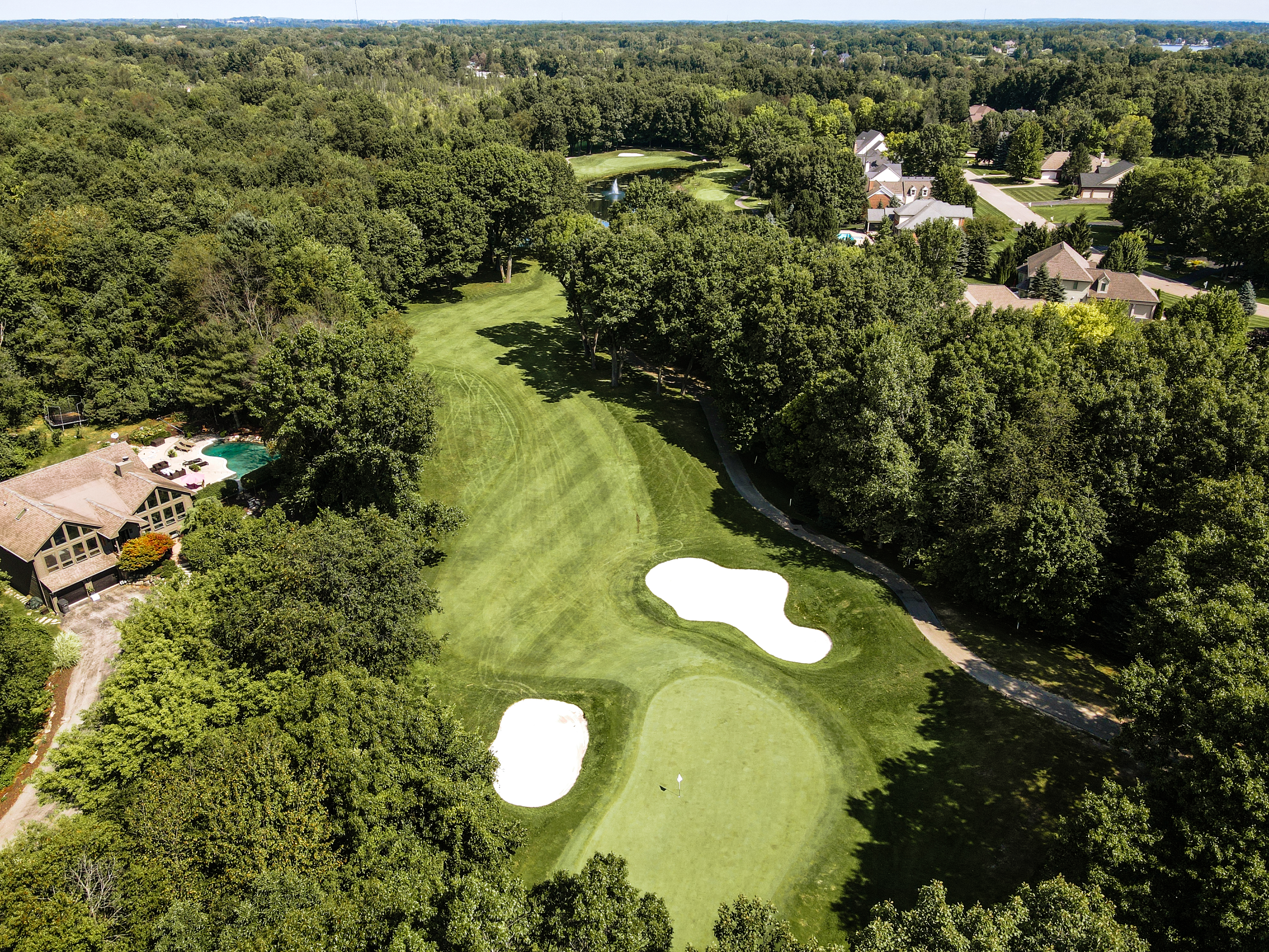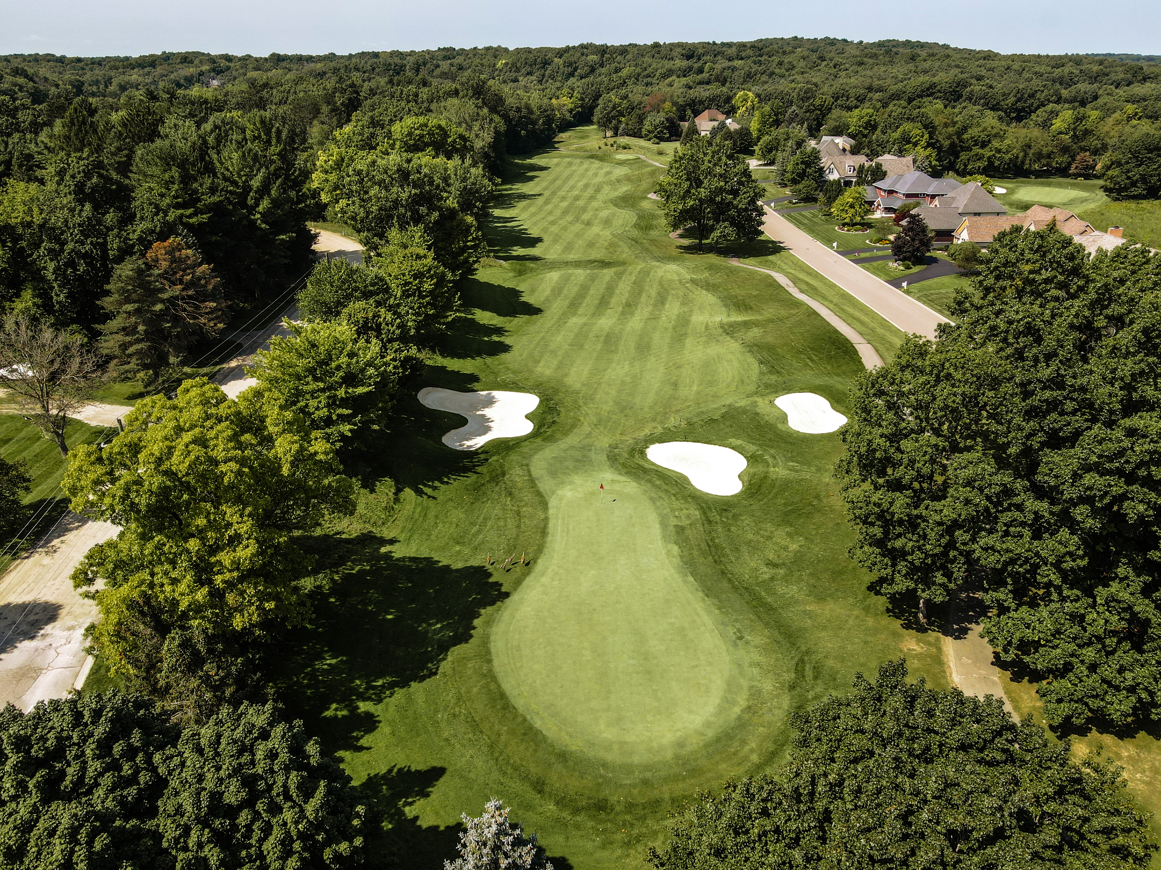 Walking up to the tee of this beautiful hole, Crooked Lake just beyond the flag stick creates a Scenic back drop. This green is protected by a front left bunker and another wrapping the backside of the green